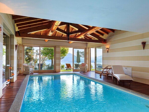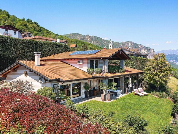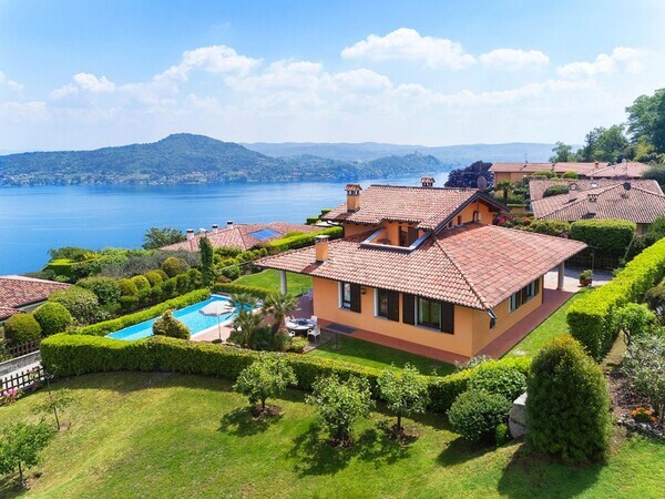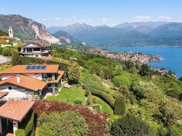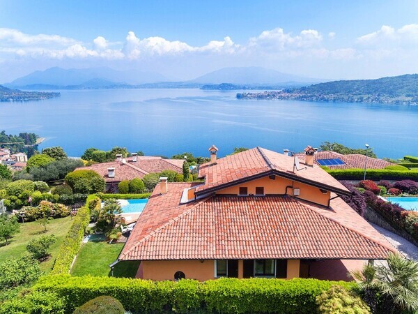 Stay at Villa Moncalvo near Arona on Lake Maggiore: private villa with pool, fenced garden, panoramic lake views, covered terrace and space for a relaxing family holiday in Italy.